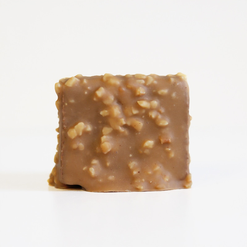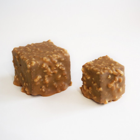 Succombez à notre incontournable et irrésistible rocher au chocolat dulcey. Une maxi bouchée de praliné amandes/noisettes crunchy et fondant à la fois, enrobée de chocolat dulcey et d'amandes torréfiées. Pour une pause goûter ultra gourmande garantie ! Détails techniques: DLC: 6 mois Poids: 80 g Dimensions: Largeur 4cm, longueur 4cm, hauteur 3,5cm Conservation: 6 mois dans un endroit frais et sec, à température ambiante (maximum 20 ° C). Ingrédients: Praliné (sucre, noisettes, amandes, émulsifiant : lécithine de tournesol, extrait naturel de vanille), chocolat au lait (sucre, beurre de cacao, lait entier en poudre, fèves de cacao, émulsifiant : lécithine de tournesol, extrait naturel de vanille), chocolat blanc (beurre de cacao, sucre, lait entier en poudre, lait écrémé en poudre, lactoserum, beurre, émulsifiant: lécithine de tournesol [E322], extrait naturel de vanille), amandes Valeurs nutritionnelles: Détails (%) Matières grasses (g) Dont Acides gras saturés (g) Glucides (g) Dont Sucres (g) Protéines (g) Sel (g) Total 100% 31 8,8 52 50 8,6 0,07 Valeur énergétique de la recette pour 100g Total 534 Kcal 2227 Kjoule