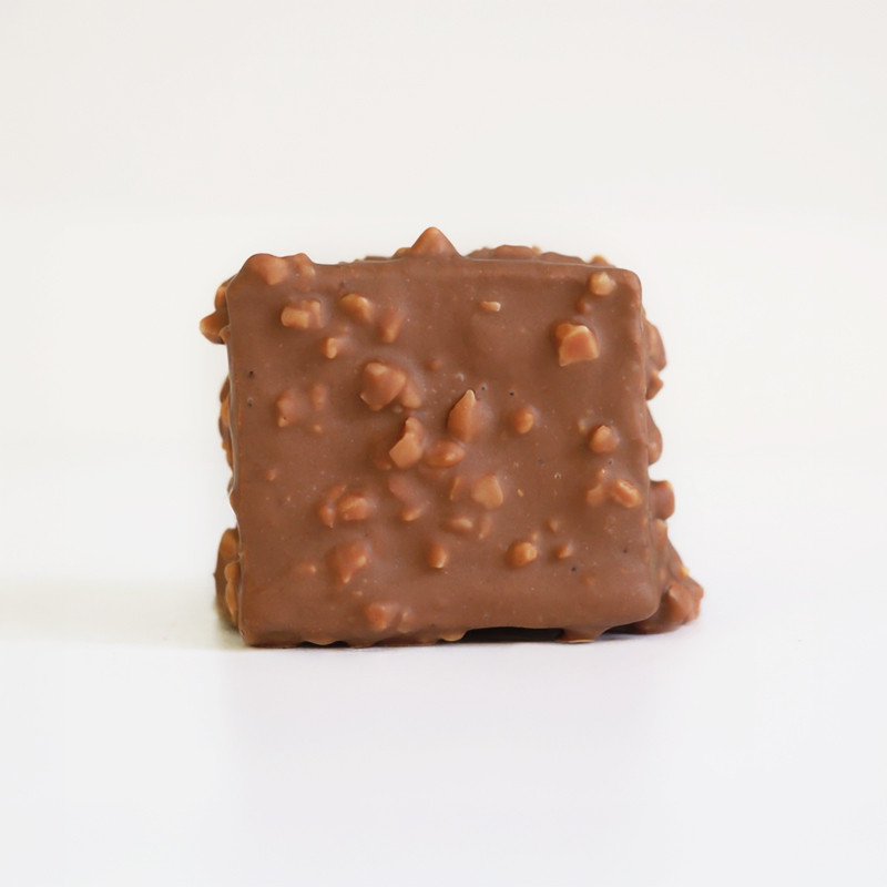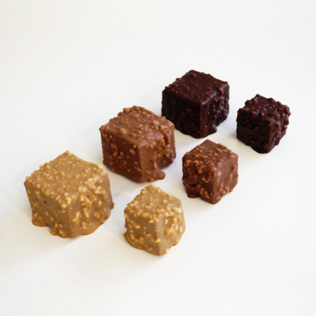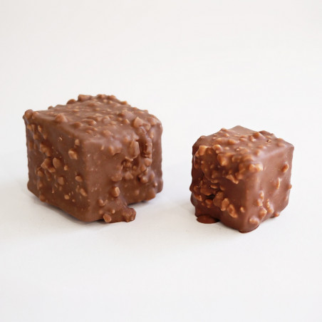 Succombez à notre incontournable et irrésistible rocher au chocolat au lait. Une maxi bouchée de praliné amandes/noisettes crunchy et fondant à la fois, enrobée de chocolat au lait et d'amandes torréfiées. Pour une pause goûter ultra gourmande garantie ! Détails techniques: DLC: 6 mois Poids: 80 g Dimensions: Largeur 4cm, longueur 4cm, hauteur 3,5cm Conservation: 6 mois dans un endroit frais et sec, à température ambiante (maximum 20 ° C). Ingrédients: Praliné (sucre, noisettes, amandes, émulsifiant : lécithine de tournesol, extrait naturel de vanille), chocolat au lait (sucre, beurre de cacao, lait entier en poudre, fèves de cacao, émulsifiant : lécithine de tournesol, extrait naturel de vanille), amandes Valeurs nutritionnelles: Détails (%) Matières grasses (g) Dont Acides gras saturés (g) Glucides (g) Dont Sucres (g) Protéines (g) Sel (g) Total 100% 31 8,7 52 50 8,5 0,05 Valeur énergétique de la recette pour 100g Total 532 Kcal 2220 Kjoule