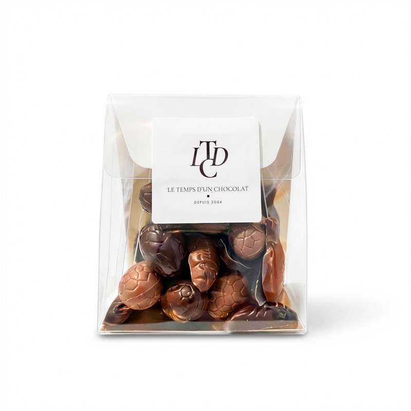 Assortiments de fritures et œufs pralinés en chocolat au lait 41 % Jivara et chocolat noir 66 % Caraïbe.