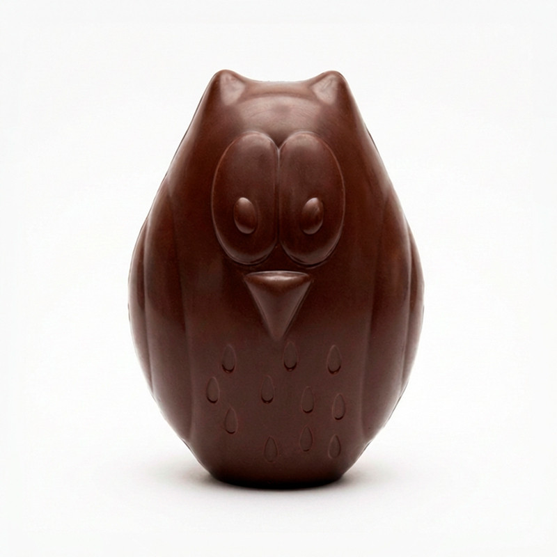 Moulage en chocolat noir 66 % Caraïbe, garni d'un assortiment de fritures et d'œufs pralinés réalisés dans le même chocolat.